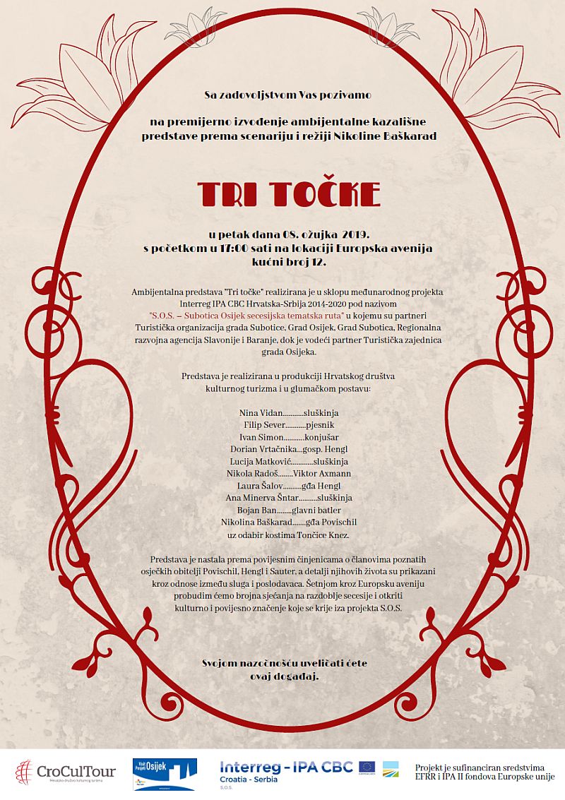 Prigodom premijernog izvođenja ambijentalne kazališne predstave pod nazivom "Tri točke" pozivamo Vas da svojom nazočnošću uveličate ovaj događaj nastao u sklopu međunarodnog projekta Interreg IPA CBC Hrvatska - Srbija 2014 - 2020 pod nazivom "S.O.S. Subotica Osijek secesijska tematska ruta".